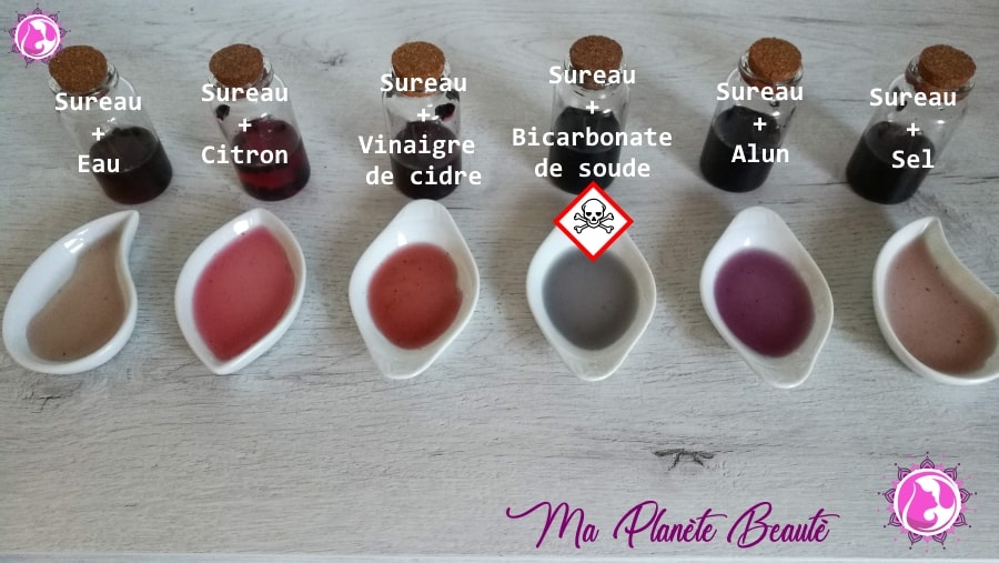 Les différentes bases : eau ou citron ou vinaigre de cidre ou bicarbonate de soude ou alun ou sel ne donnent pas une grande différence de teinte avec le santal rouge.