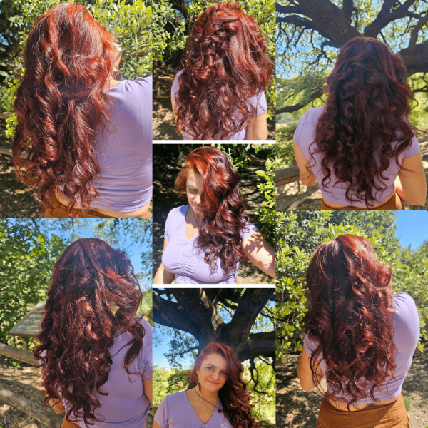 Henné Yémen + HennéRajasthan + Henné Gabès + Henné Tazarine + Cassia + Hibiscus avec congélation de la pâte 8h + repos 6h + pose 3h30 (le résultat est plus foncé, dû à une pose plus longue et aussi au Henné Gabès).