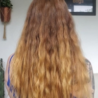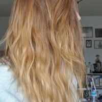 Coloration Khadi Sunrise : 1h Coloration Khadi Blond cendré + Khadi moyen : 50min. Puis coloration blond moyen + henné neutre 30min pour enlever reflets verts. Cliente ravie car elle n'a vraiment presque plus de démarcation entre le reste de la chimie et de sa base naturelle.