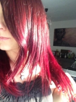 Ma base était un rouge semi permanent délavé et dégorgé au masque lait de Coco et Argile verte. Ma recette la suivante henné Damask, Red kamala et infusion de baies de Sureau.