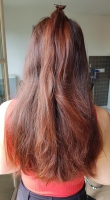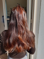 Résultat de la coloration cultivator's red + décoction campêche sel sur base châtain clair avec restes de balayages, Henné Sénégal en 1er temps pour les blancs, pose nuit 10h