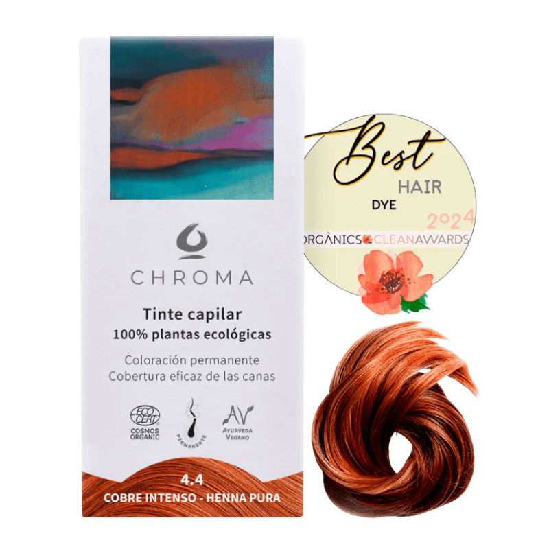 Découvrez la teinte 4.4 Cuivre Intense de CHROMA, formulé avec du Henné 100% biologique (Lawsonia inermis) pour une couleur flamboyante.